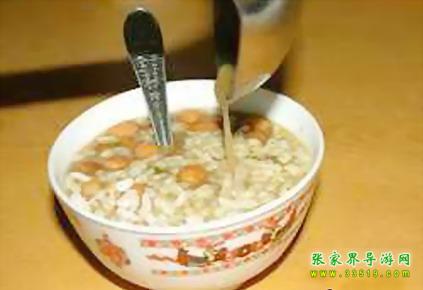 油茶湯對(duì)土家族人來(lái)說(shuō)一日三餐少不了。土家油茶湯是張家界土家族具有代表性的包含文化現(xiàn)象之一,土家語(yǔ)稱“色斯?jié)缮?rdquo;,堪稱中國(guó)茶文化一絕,源遠(yuǎn)流長(zhǎng)。據(jù)清代的古書(shū)記載:“土人以油炸黃豆,包谷,米花,綠焦諸物,取水和油,煮茶葉和湯泡之,餉客致敬,名曰:‘油茶’”。