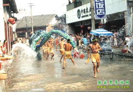 張家界潑水龍又叫“澆水龍”,于唐朝時期由移居本地的白族興起演變而成,在永定區(qū)的尹家溪鎮(zhèn)西尹村、莫家崗村十分盛行,是當(dāng)?shù)?a class="insidelink" href="http://www.bdsjlm.com/fengqing/1130174734.html" target="_blank" title="土家族">土家族,白族、苗族在天熱干旱時節(jié)求雨祈福的一種形式。一旦出現(xiàn)旱災(zāi),當(dāng)?shù)仡^面人物就會出來組織潑水龍,演出極其隆重。