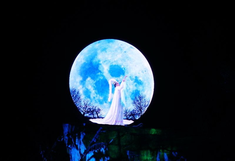 本項(xiàng)目舞臺(tái)及舞美設(shè)施為目前世界范圍內(nèi)的實(shí)景演出中投資最多、舞臺(tái)機(jī)械裝置最為復(fù)雜且規(guī)模最大、燈光設(shè)施數(shù)量最多且分布范圍最大的,另外主舞臺(tái)也是世界最大的全景玻璃鋼舞臺(tái)(10000平方米)。舞臺(tái)機(jī)械設(shè)施中,尤其是跨度60米、高度32米的伸縮飛橋,是目前世界范圍的演出項(xiàng)目中絕無僅有的大型舞臺(tái)機(jī)械裝置。燈光數(shù)量:大型燈光1100盞,中小型燈光2800盞;演出音響為專門定制的美國(guó)EAW音戶外防雨、防潮音響設(shè)備,也是目前國(guó)內(nèi)演出項(xiàng)目中投資最大的。